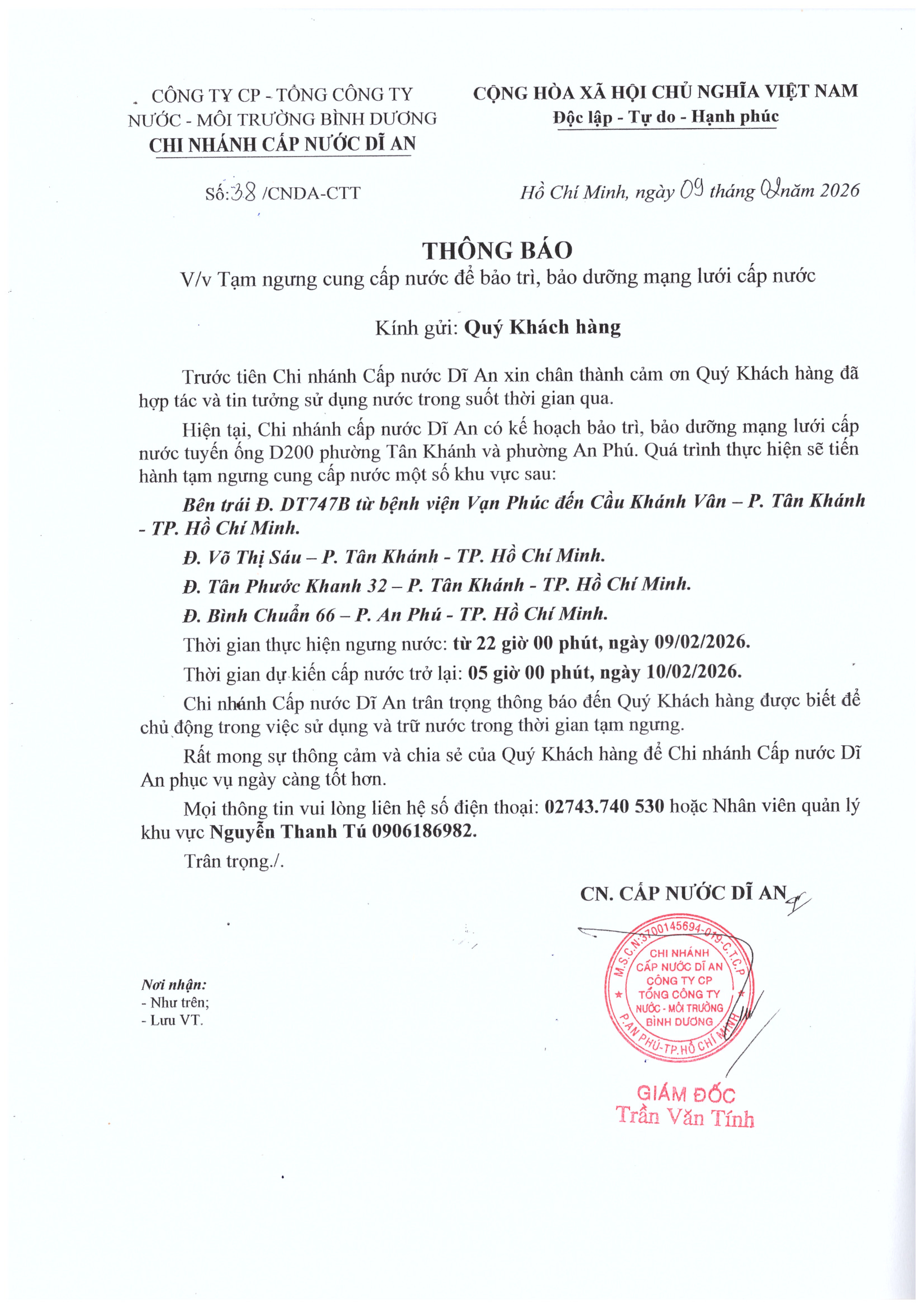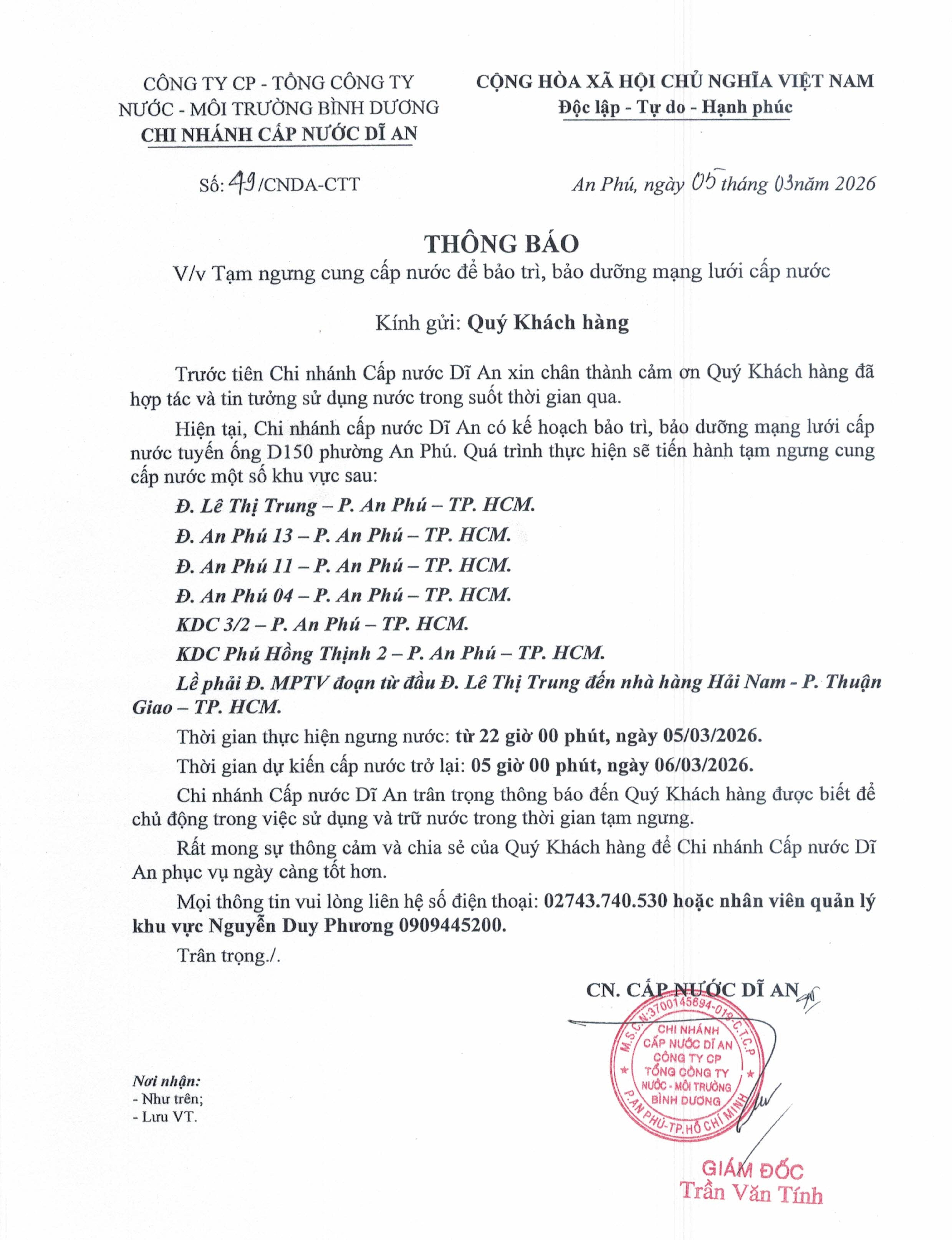 Tạm ngưng cấp nước khu vực Dĩ An: mạng lưới cấp nước tuyến ống D200 P. Tân Phước Khánh và P. An Phú