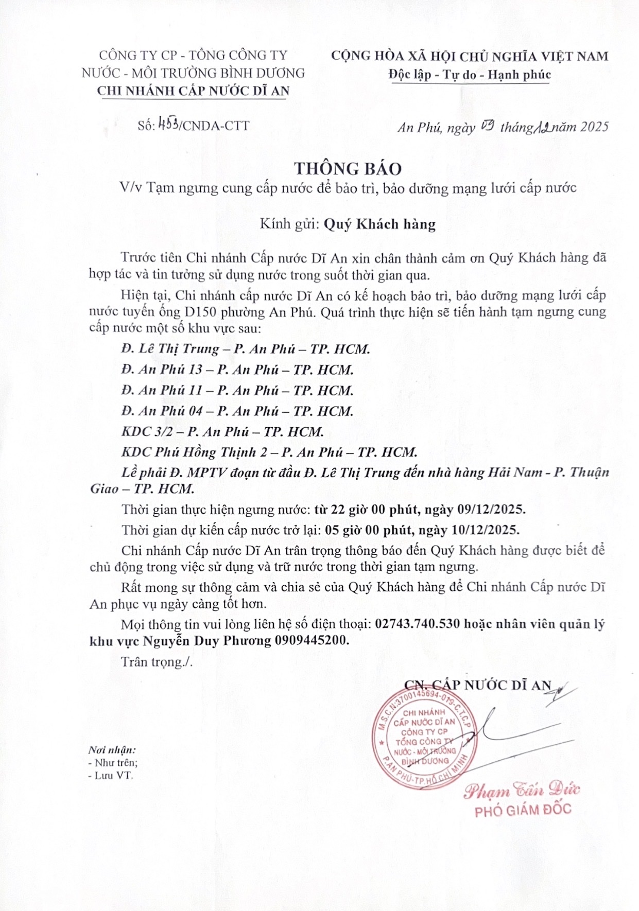 Tạm ngưng cấp nước khu vực Dĩ An: tuyến ống D150 phường An Phú.