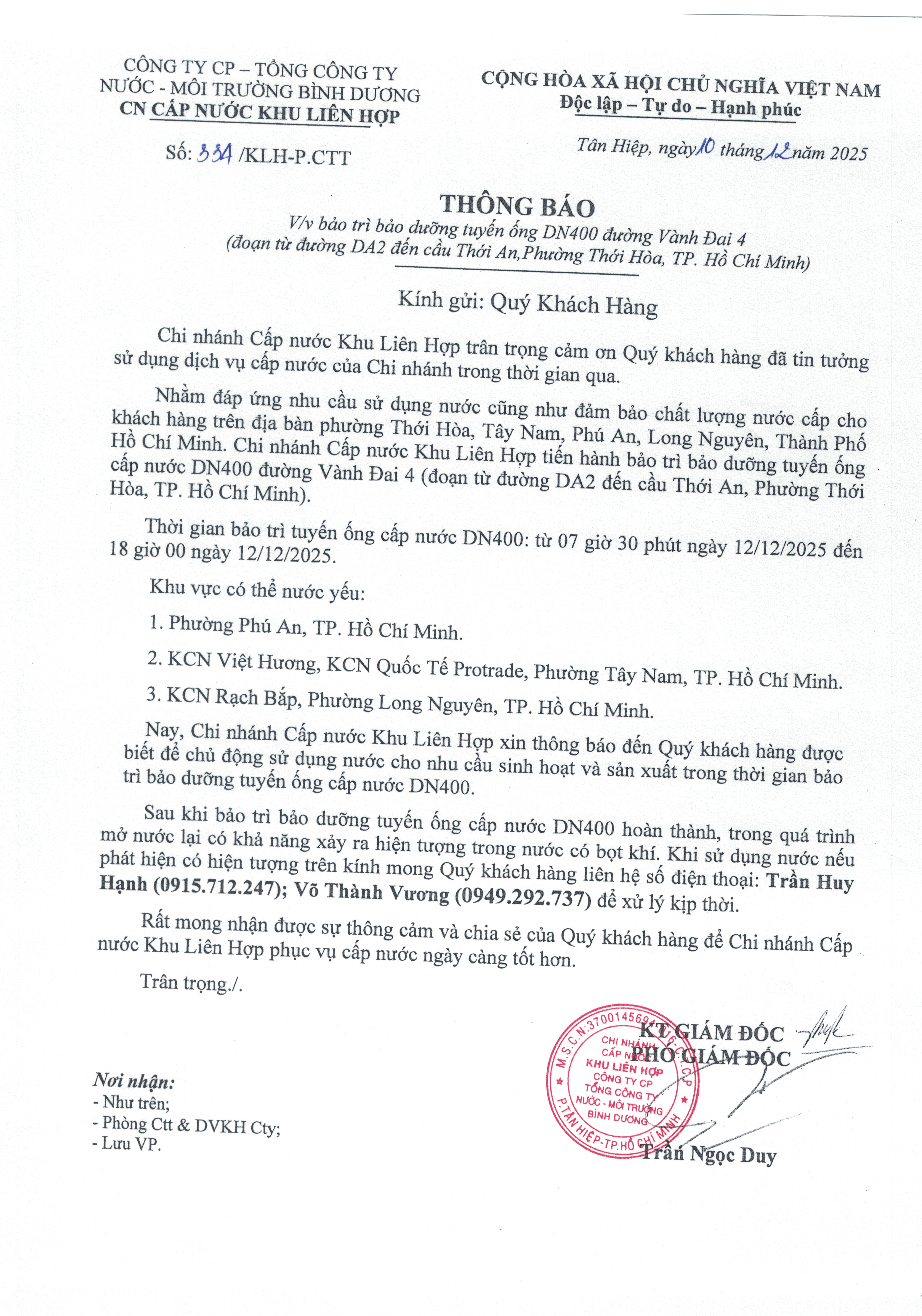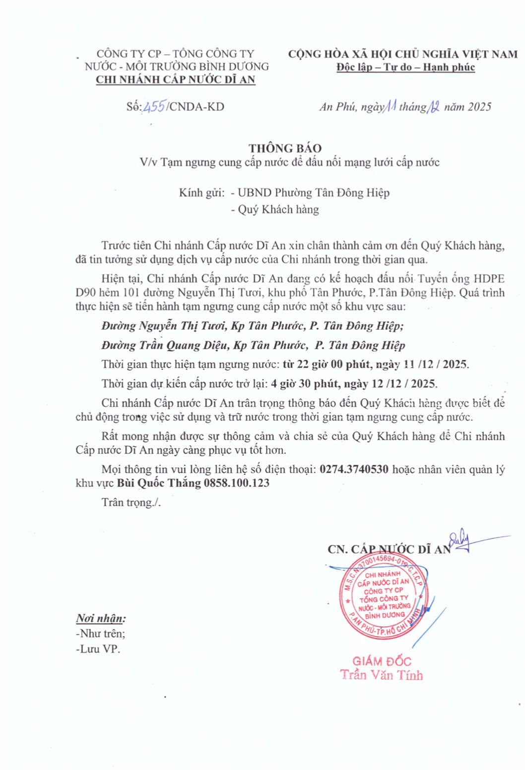 Tạm ngưng cấp nước khu vực Khu Liên Hợp: tuyến ống D100 bên phải đường Mỹ Phước Tân Vạn (đoạn từ đường Nguyễn Văn Thành đến Trường Tiểu học Định Phước), Kp.1, P.Hòa Lợi