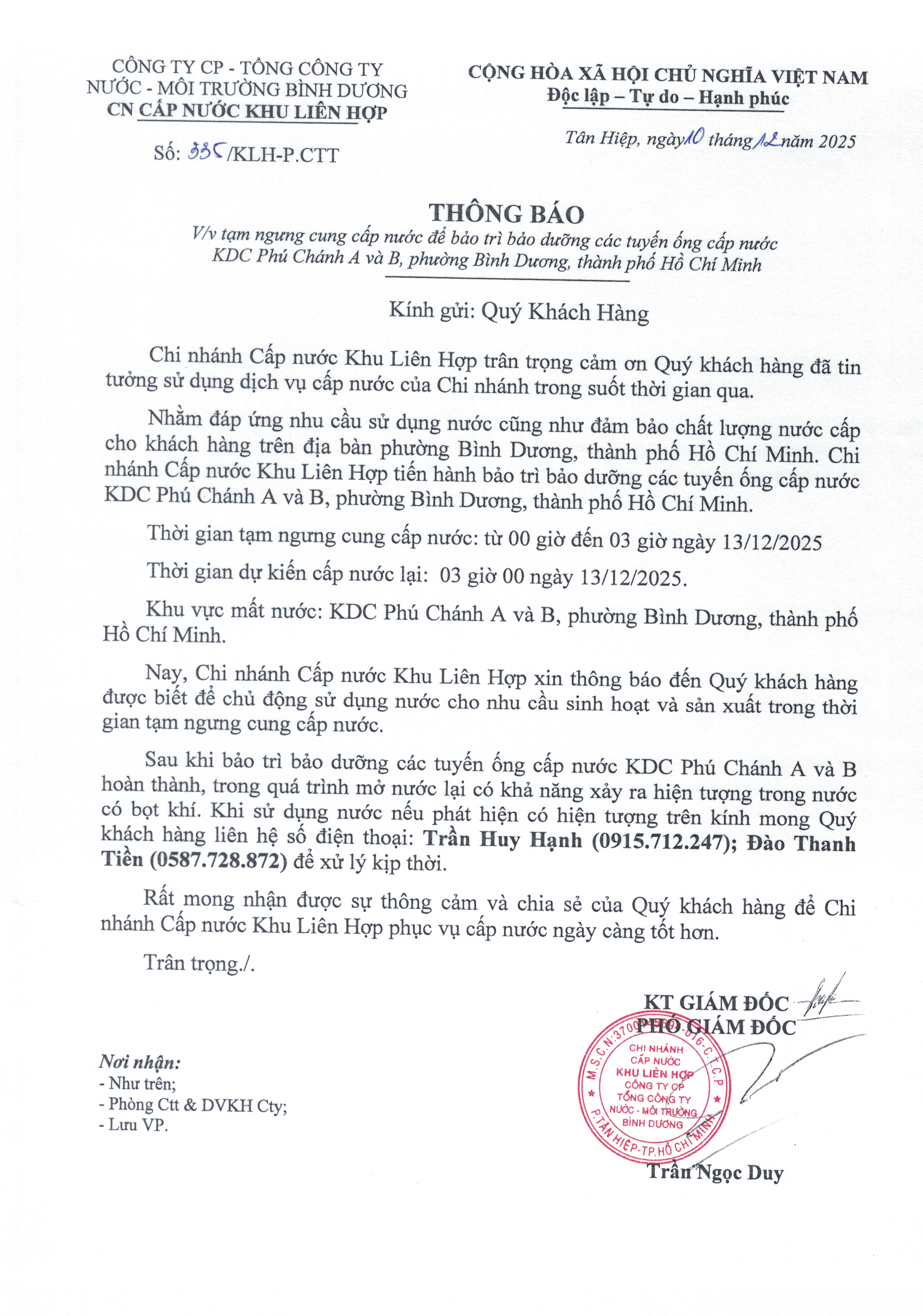 Tạm ngưng cấp nước khu vực Khu Liên Hợp: các tuyến ống cấp nước KDC Phú Chánh A và B, P.Bình Dương, Tp.Hồ Chí Minh